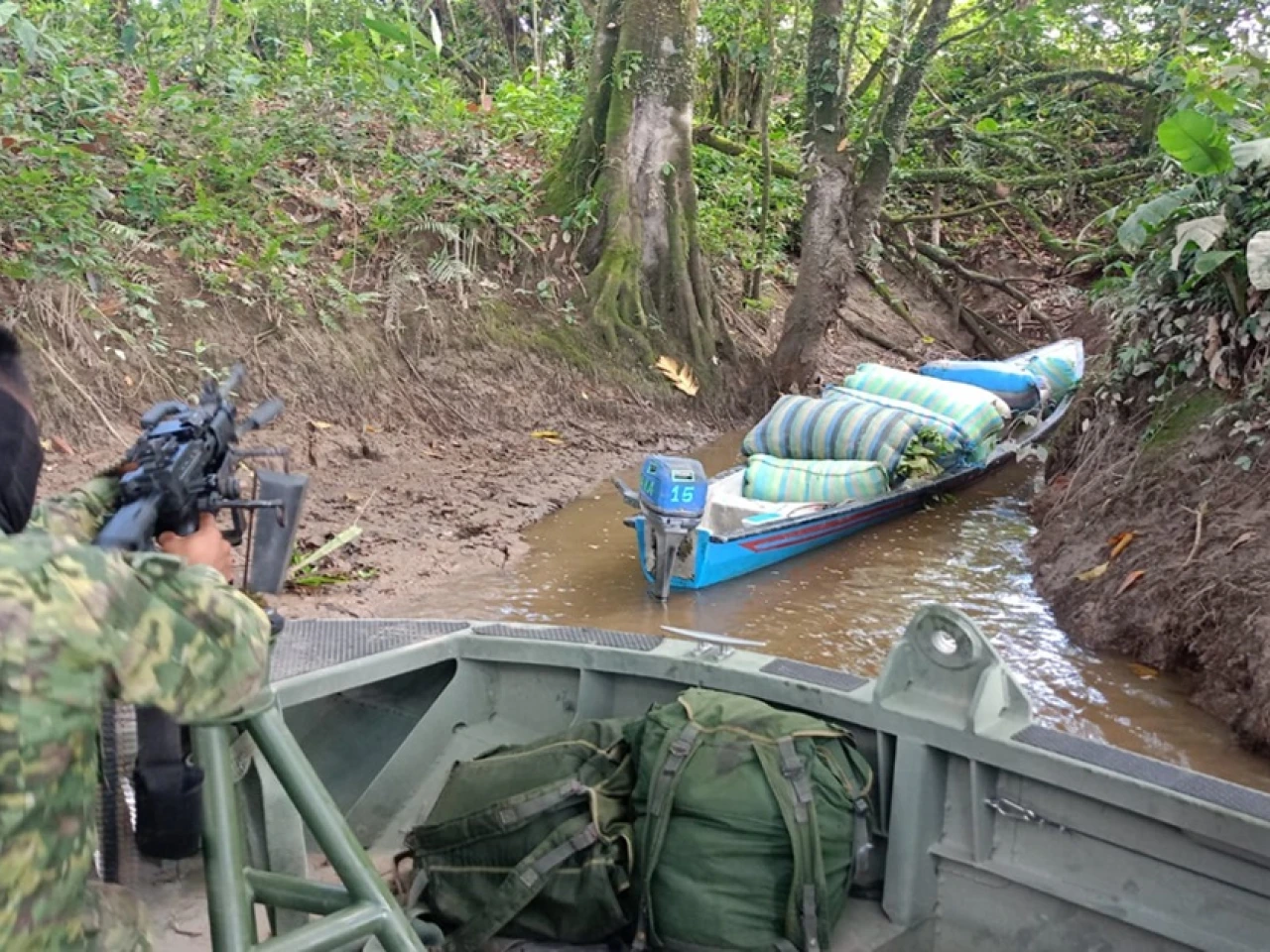 En un segundo operativo, el 12 de noviembre, esta vez en la parroquia Santa Elena, del cantón Putumayo, se localizó otra embarcación que transportaba aproximadamente 800 kg de hojas de coca, distribuidas en 16 sacos de yute.