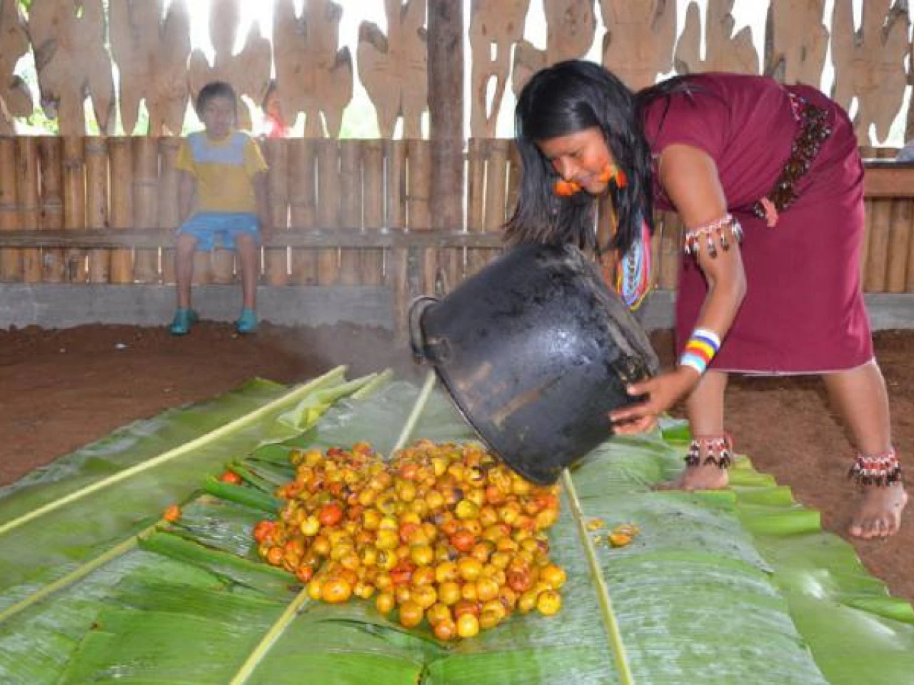 Las mujeres mastican los frutos, en un momento donde todos tienen la oportunidad de compartir sus aventuras y hazañas diarias.