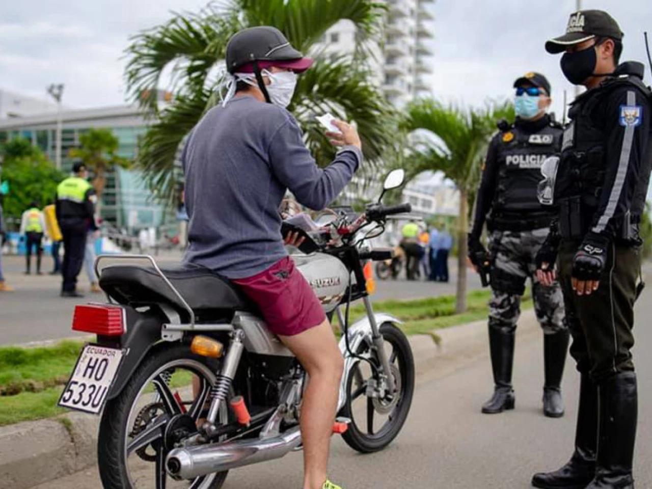 En Manta, miembros de la Policía controlan la circulación en el sector del malecón el 24 de abril de 2020. - Foto: Municipio de Manta