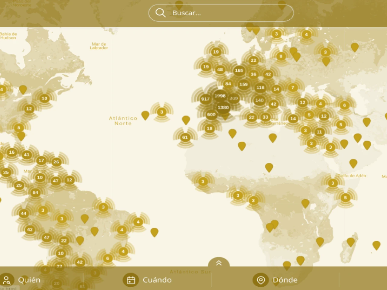 El usuario puede hacer zum para aproximarse al punto que escoja en el mapa y al posarse sobre cada marcador geográfico, se muestra una ventana con el listado de personajes nacidos o muertos en ese sitio por orden alfabético y de los hitos que allí sucedieron clasificados cronológicamente.