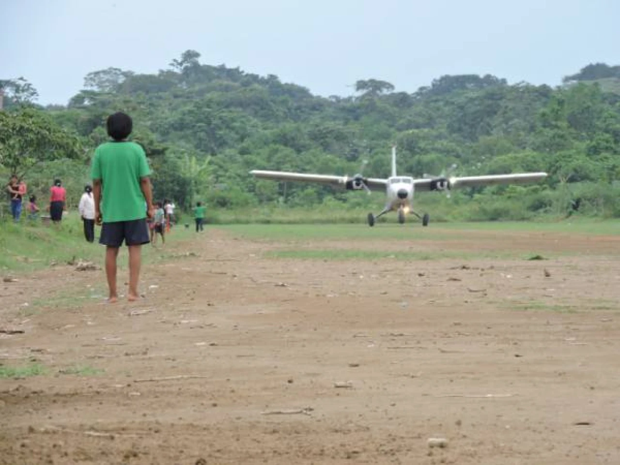 Niños descalzos con coloridas camisetas, jóvenes y adultos de la comuna Wampuik, en la parroquia Huasaga, cantón Taisha, en la provincia de Morona Santiago, formaron un pasillo de honor para recibir a dos aviones Twin Otter DHC-6 de la Fuerza Aérea Ecuatoriana (FAE), la tarde del martes 20.