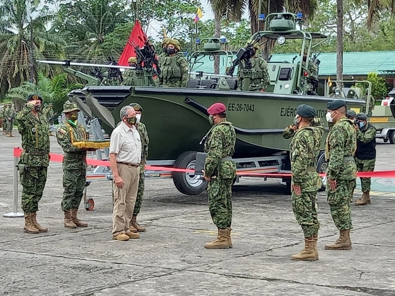Oswaldo Jarrín, ministro de Defensa, hizo la entrega de las 12 lanchas, armamento para las embarcaciones, casos y chalecos al general Washington Buñay, comandante general del Ejército ecuatoriano.