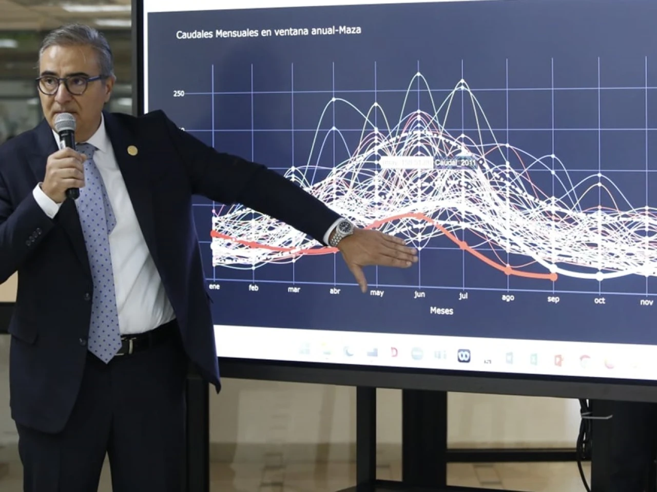 Con gráficos para explicar la situación detallada, el ministro aseveró que los datos enseñan claramente "que el estiaje se adelantó prácticamente tres meses a cualquier proyección".