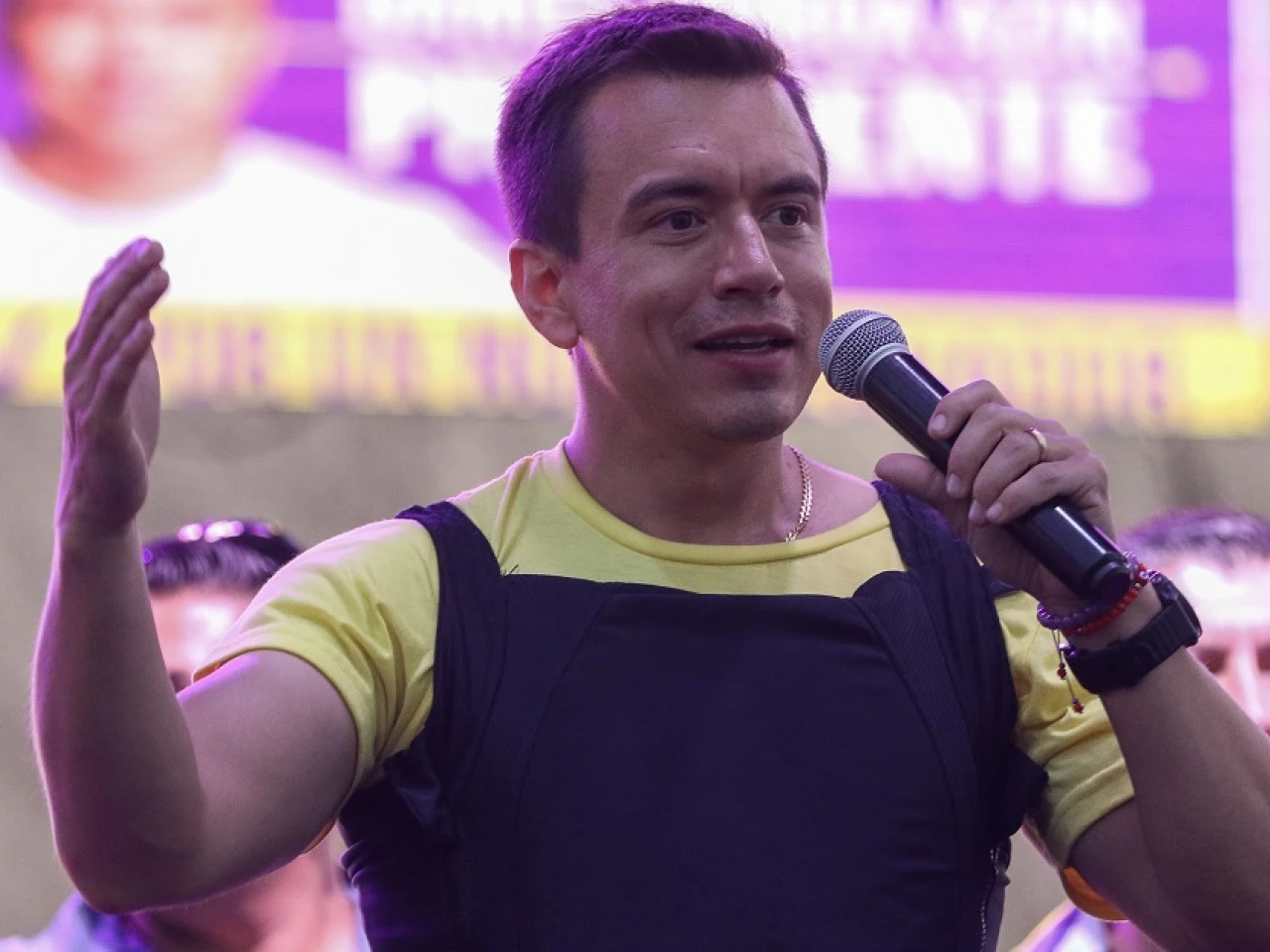 Ambos aspirantes aparecieron en los escenarios con chaleco antibalas, una prenda que se ha vuelto ya imprescindible en esta campaña electoral después del asesinato del candidato Fernando Villavicencio antes de la celebración de la primera vuelta, además de fuertemente resguardados por un nutrido grupo de escoltas policiales y militares.