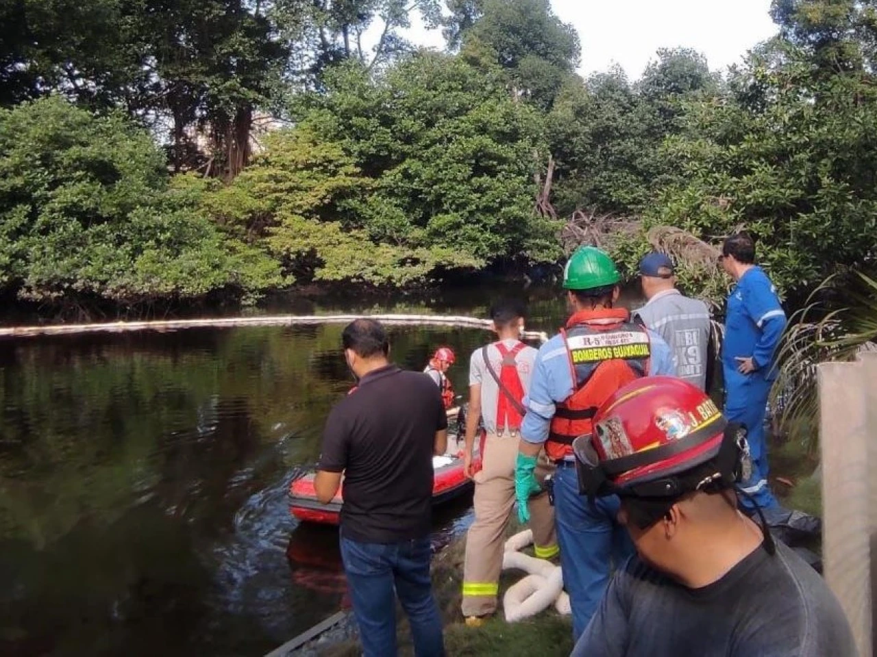 Hasta el sitio también llegó personal de la petrolera estatal Petroecuador para apoyar en los trabajos de contención del hidrocarburo y de la empresa Interagua, encargada de suministrar el agua potable en Guayaquil, para tomar muestras del líquido para su análisis.