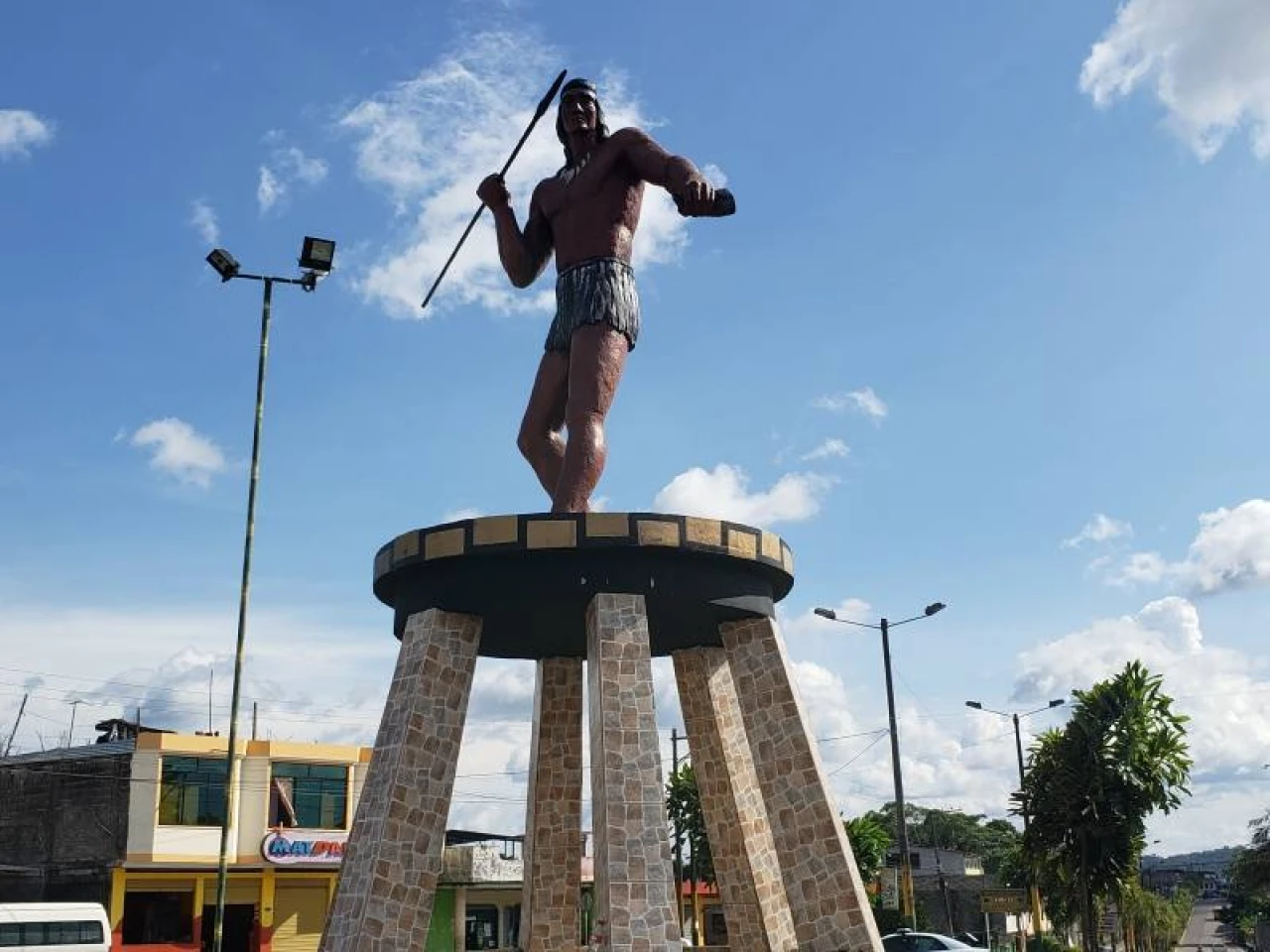 Fue en el redondel en el que se encuentra el monumento en su honor, que está a la entrada de Tena. Jumandi es uno de los líderes de la resistencia indígena que organizó una revuelta para expulsar a los españoles que sometían a los pueblos del Oriente. Por su lucha, que le costó la vida con otros combatientes indígenas, fue declarado en 2011 Héroe Nacional por la Asamblea de Ecuador.