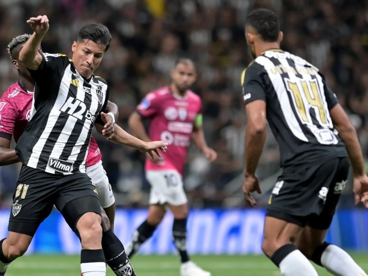 El conjunto dirigido por el argentino Jorge Sampaoli fue protagonista desde el inicio, con una presión alta que incomodó a los ecuatorianos y generó varias opciones de gol. La resistencia visitante se rompió a los 35 minutos, cuando Guilherme Arana aprovechó una serie de rebotes para anotar. Siete minutos más tarde, Bernard amplió la ventaja tras otra asistencia de Dudu.