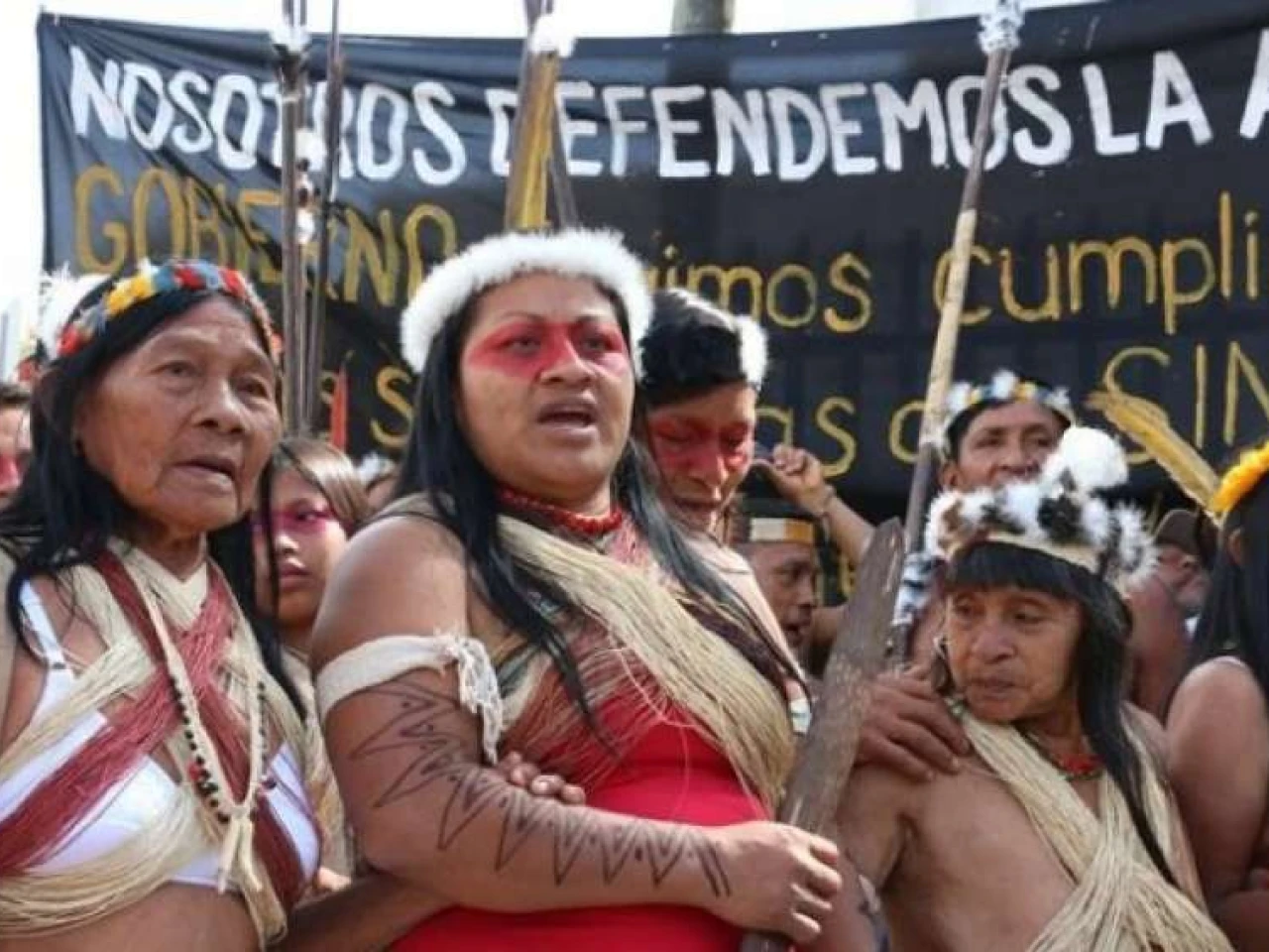 Ataviados con penachos, cintos de paja, collares de semillas, de huesos, y lanzas en mano, decenas de hombres y mujeres con sus caras pintadas, en su mayoría de la nacionalidad amazónica waorani, participaron en la concentración en la que entonaron en sus lenguas originarias cánticos "por la defensa del territorio".