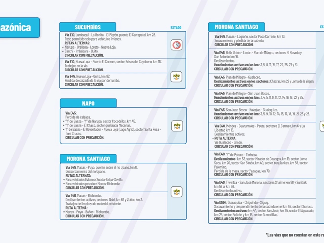 Vía E40: “Y” de Patuca-Tiwintza. Deslizamientos, km 53, Sector Mirador de Coangos, km 19 sector Loma Seca, km 12 Sector San Simón, km 40 sector Yuquiankas, km 68 sector Palomnino. Pérdida de la mesa de la vía, km 79 sector Yapapas. Circular con precaución.