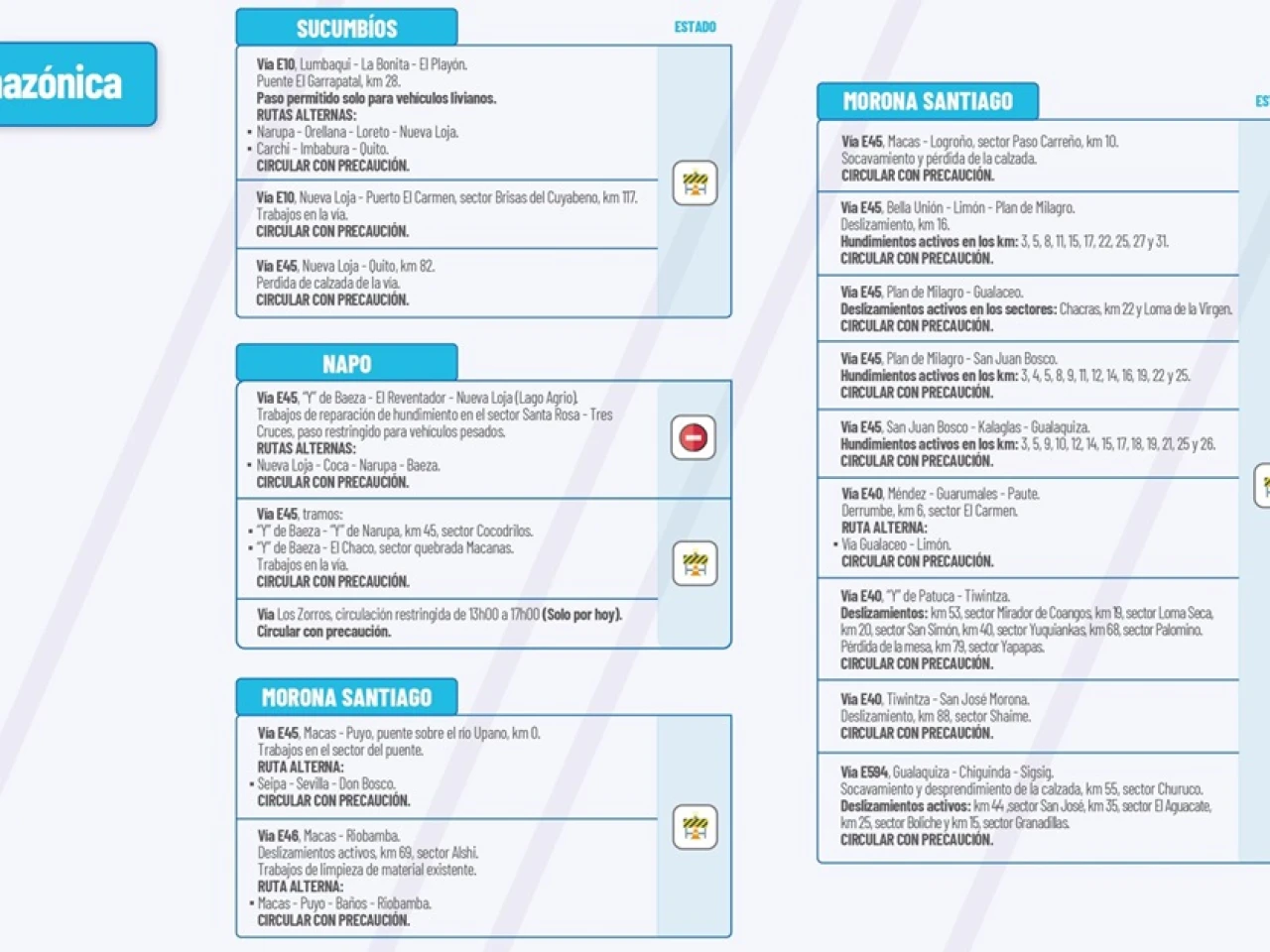 Vía E40: “Y” de Patuca-Tiwintza. Deslizamientos, km 53, Sector Mirador de Coangos, km 19 sector Loma Seca, km 12 Sector San Simón, km 40 sector Yuquiankas, km 68 sector Palomnino. Pérdida de la mesa de la vía, km 79 sector Yapapas. Circular con precaución.