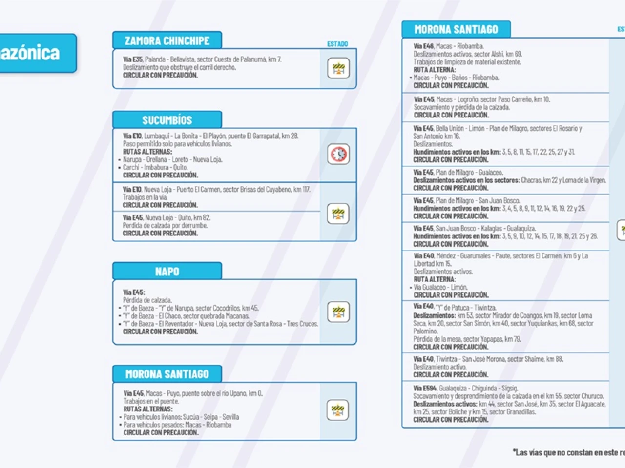 Vía E40: “Y” de Patuca-Tiwintza. Deslizamientos, km 53, Sector Mirador de Coangos, km 19 sector Loma Seca, km 12 Sector San Simón, km 40 sector Yuquiankas, km 68 sector Palomnino. Pérdida de la mesa de la vía, km 79 sector Yapapas. Circular con precaución.