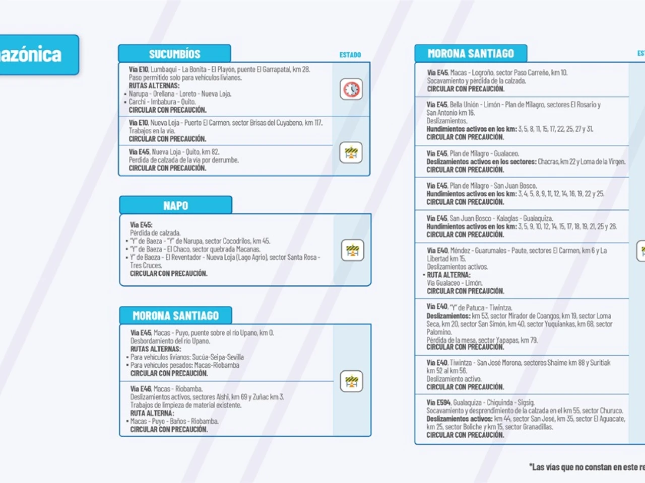Vía E45: San Juan Bosco-Kalaglas-Gualaquiza. Hundimientos activos: km2, km5 km 9, km 10, km 12, km 14, km 15, km 17, km 18, km 19, km 21, km 25, y km 26. Circular con Precaución.