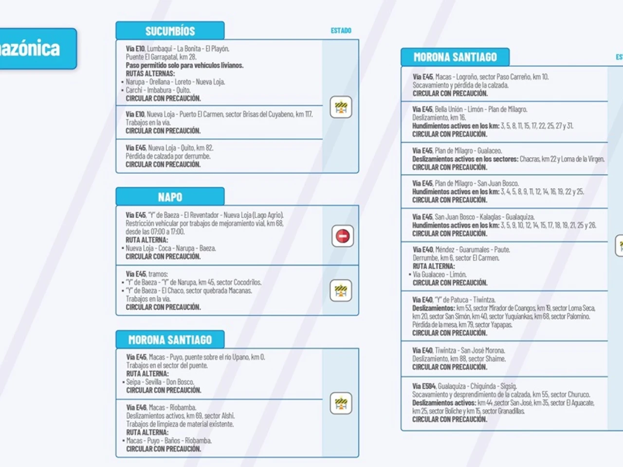 Vía E45: San Juan Bosco-Kalaglas-Gualaquiza. Hundimientos activos: km2, km5 km 9, km 10, km 12, km 14, km 15, km 17, km 18, km 19, km 21, km 25, y km 26. Circular con Precaución.