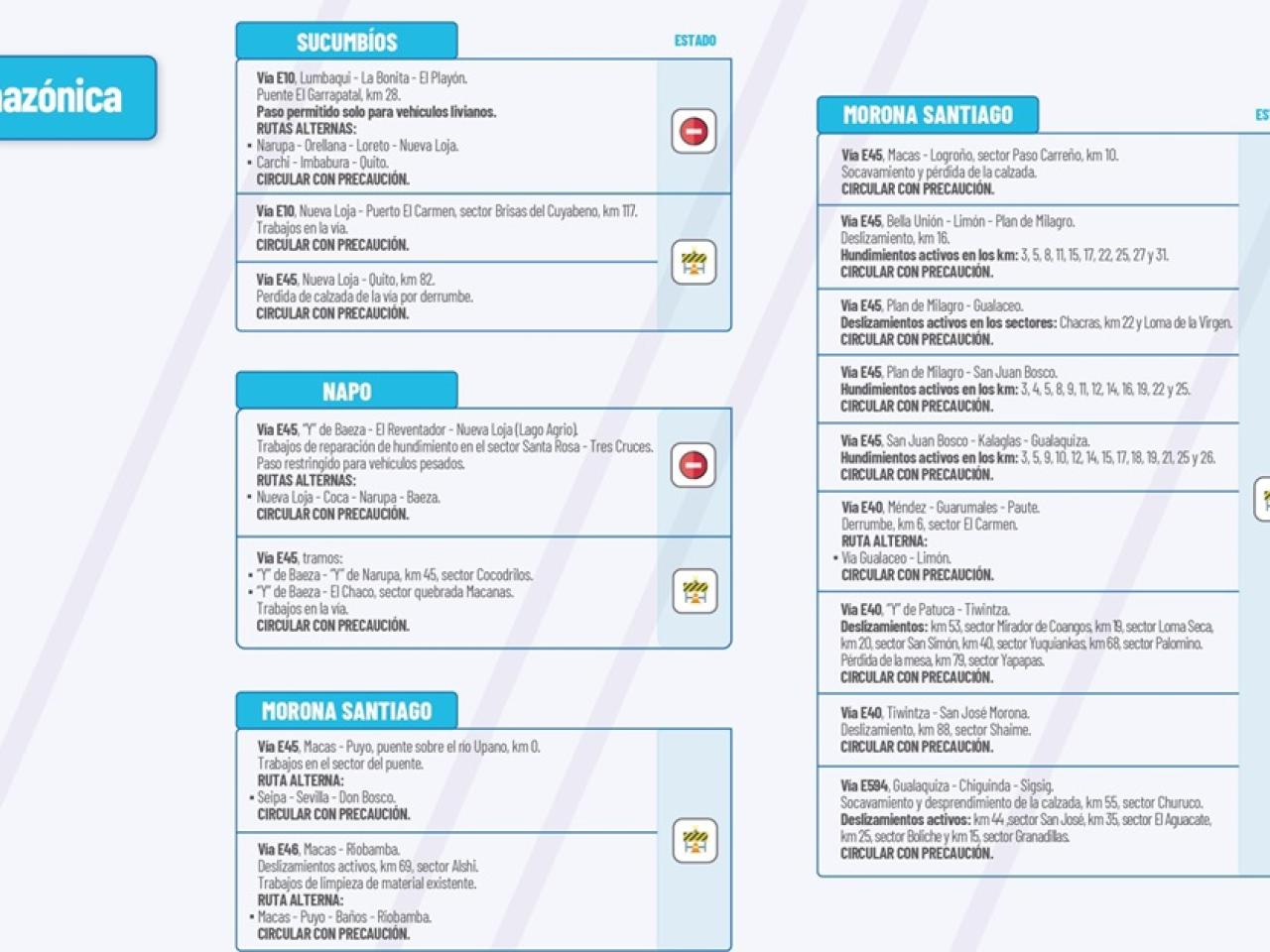 Vía E40: “Y” de Patuca-Tiwintza. Deslizamientos, km 53, Sector Mirador de Coangos, km 19 sector Loma Seca, km 12 Sector San Simón, km 40 sector Yuquiankas, km 68 sector Palomnino. Pérdida de la mesa de la vía, km 79 sector Yapapas. Circular con precaución.