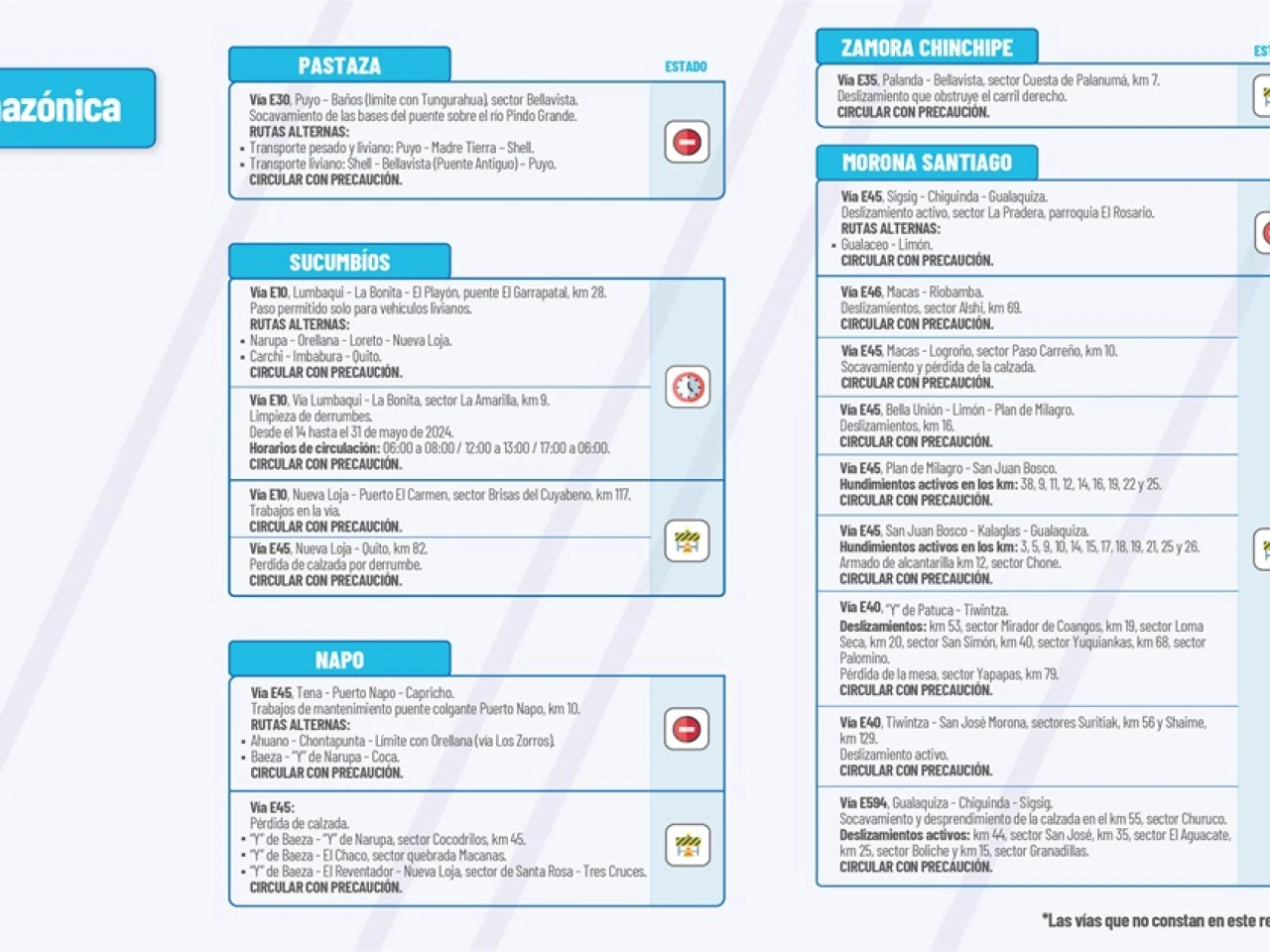 Vía E45: San Juan Bosco-Kalaglas-Gualaquiza. Hundimientos activos: km2, km5 km 9, km 10, km 12, km 14, km 15, km 17, km 18, km 19, km 21, km 25, y km 26. Circular con Precaución.