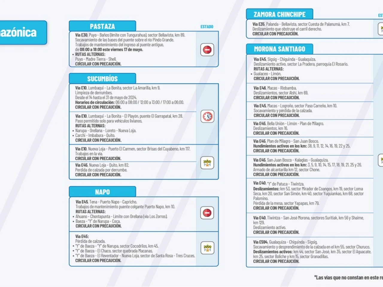 Vía E40: “Y” de Patuca-Tiwintza. Deslizamientos, km 53, Sector Mirador de Coangos, km 19 sector Loma Seca, km 12 Sector San Simón, km 40 sector Yuquiankas, km 68 sector Palomnino. Pérdida de la mesa de la vía, km 79 sector Yapapas. Circular con precaución.