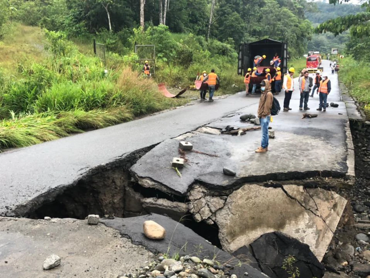 Vía Quito entre Lumbaqui y Cascales: sector puente de Puchucho, personal y maquinaria en labores de limpieza:  Circular con precaución. Deslizamientos.