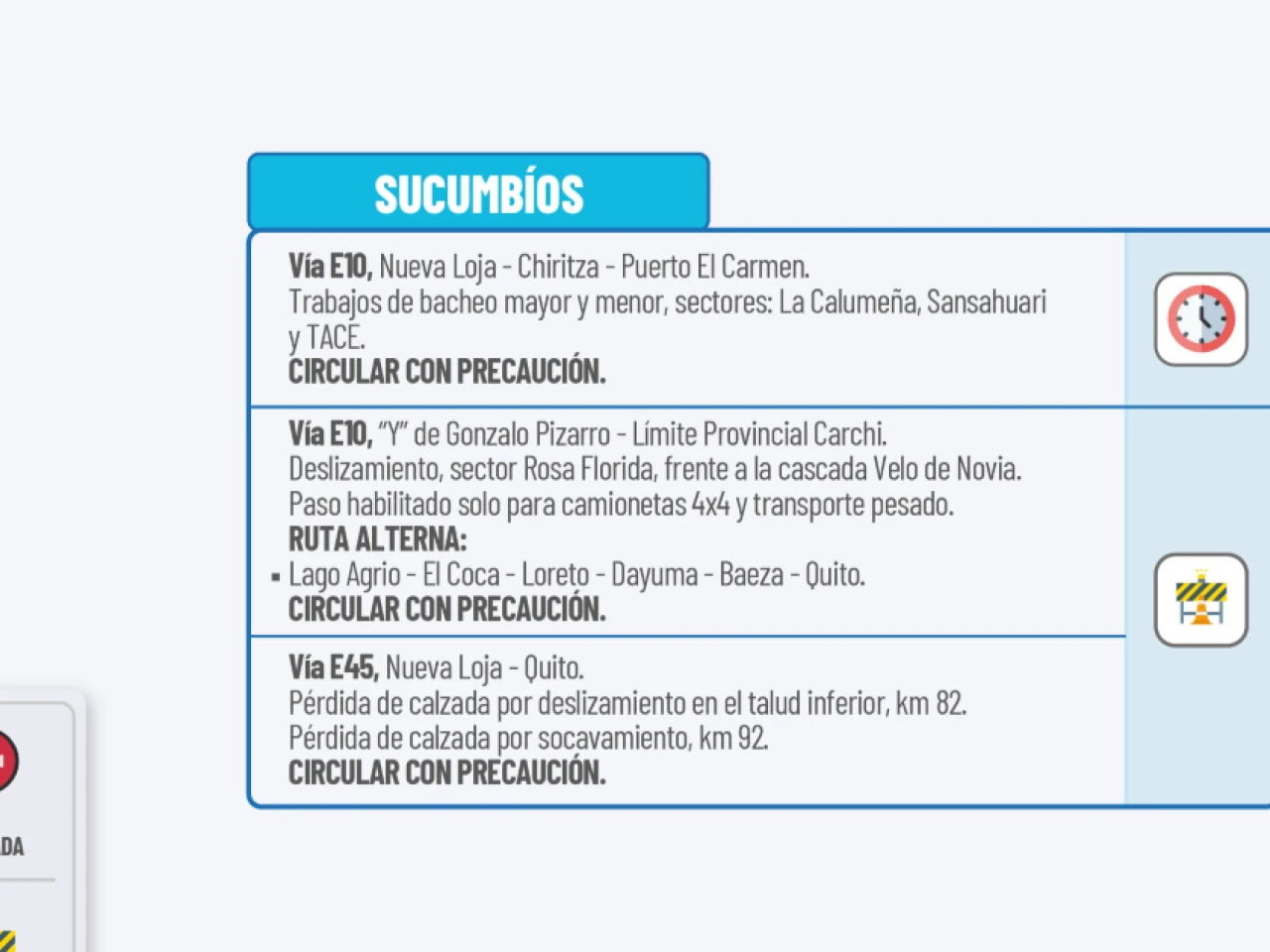 Vía E45: Nueva Loja-Quito. Pérdida de calzada por deslizamiento en el talud inferior, km 82. Pérdida de calzada por socavamiento, km 92. Circular con precaución.