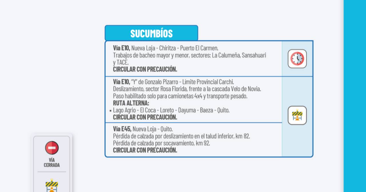 Vía E45: Nueva Loja-Quito. Pérdida de calzada por deslizamiento en el talud inferior, km 82. Pérdida de calzada por socavamiento, km 92. Circular con precaución.