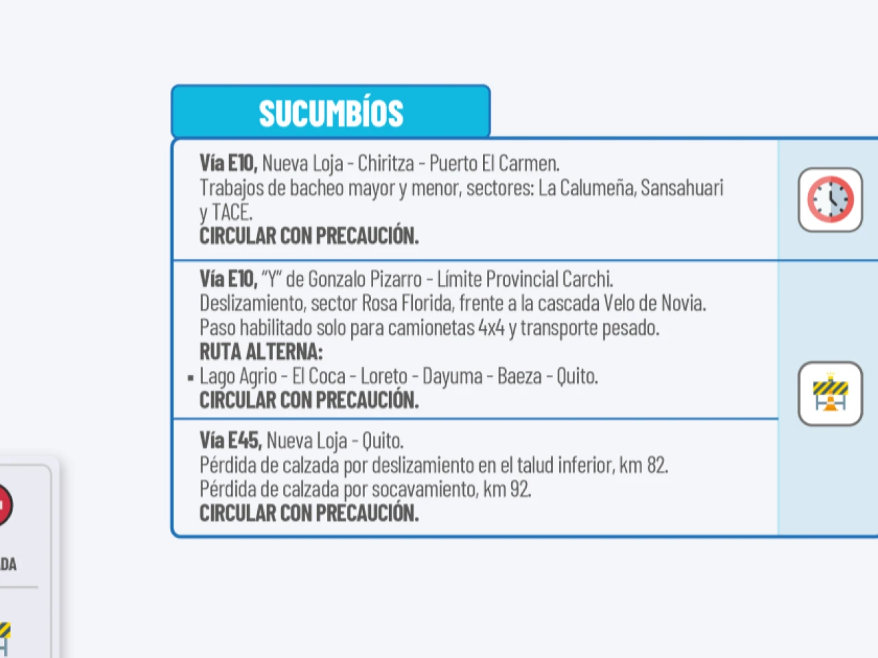 Vía E45: Nueva Loja-Quito. Pérdida de calzada por deslizamiento en el talud inferior, km 82. Pérdida de calzada por socavamiento, km 92. Circular con precaución.