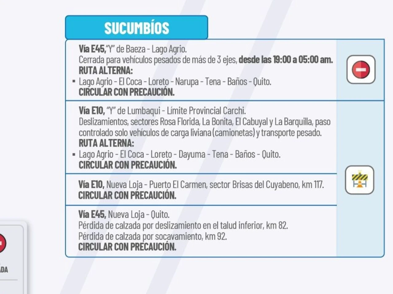 Vía E10: “Y” de Lumbaqui-Límite Provincial Carchi. Deslizamientos, sectores Rosa Florida, La Bonita, El Cabuya y La Barquilla, paso controlado solo vehículos de carga liviana (camionetas) y transporte pesado.