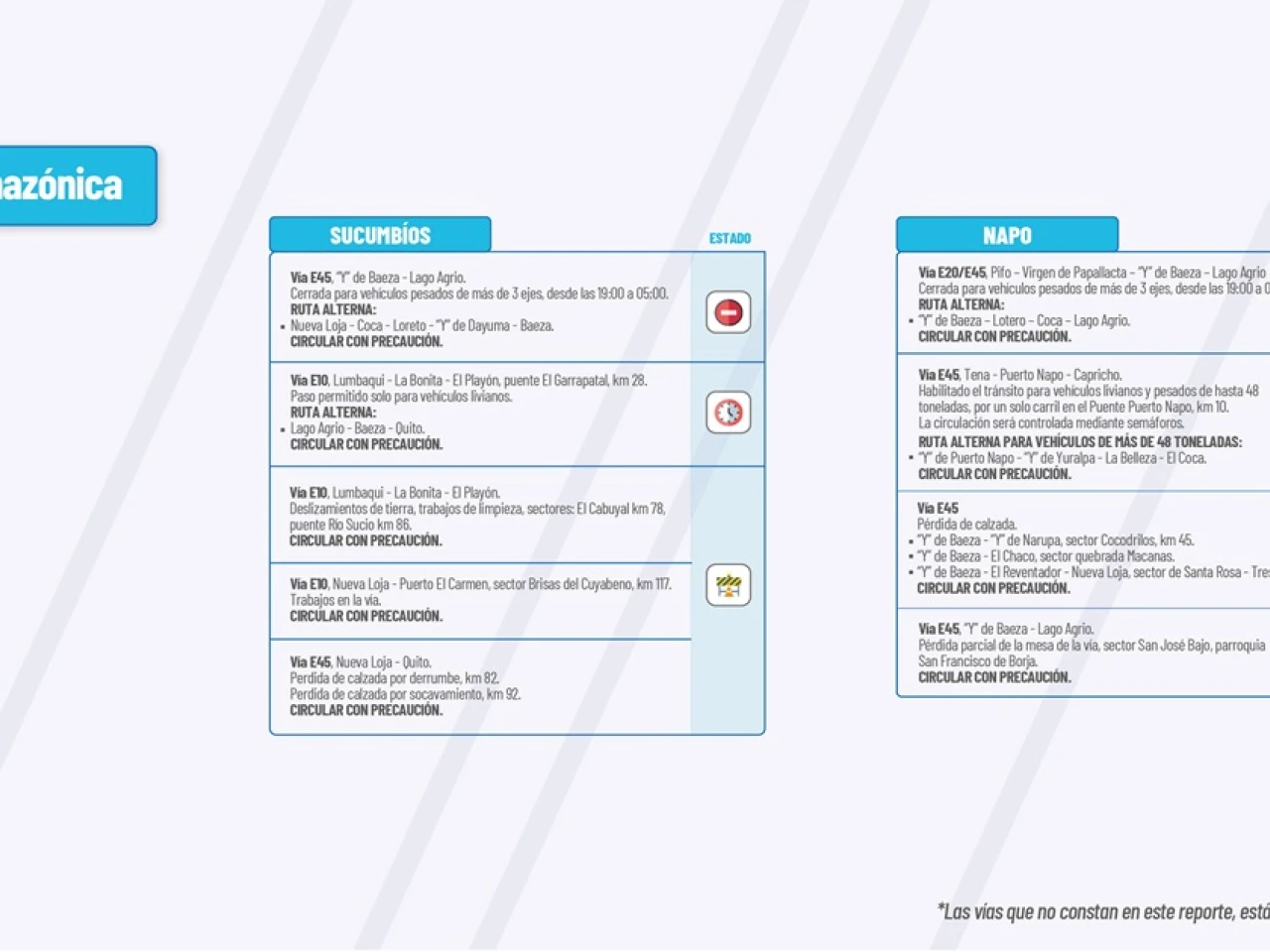 VIA E45: Tena-Puerto Napo-Capricho. Habilitado el tránsito para vehículos livianos y pesados de hasta 48 toneladas por un solo carril en el Puente Puerto Napo, km10. La circulación será controlada mediante semáforos. Circular con precaución