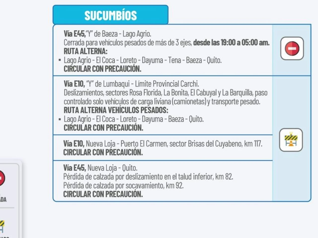 Vía E10: “Y” de Lumbaqui-Límite Provincial Carchi. Deslizamientos, sectores Rosa Florida, La Bonita, El Cabuya y La Barquilla, paso controlado solo vehículos de carga liviana (camionetas) y transporte pesado.