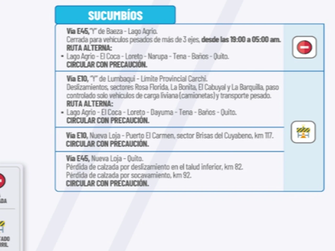 Vía E10: “Y” de Lumbaqui-Limite Provincial Carchi. Deslizamientos, sectores Rosa Florida, La Bonita, El Cabuya y La Barquilla, paso controlado solo vehículos de carga liviana (camionetas) y transporte pesado.