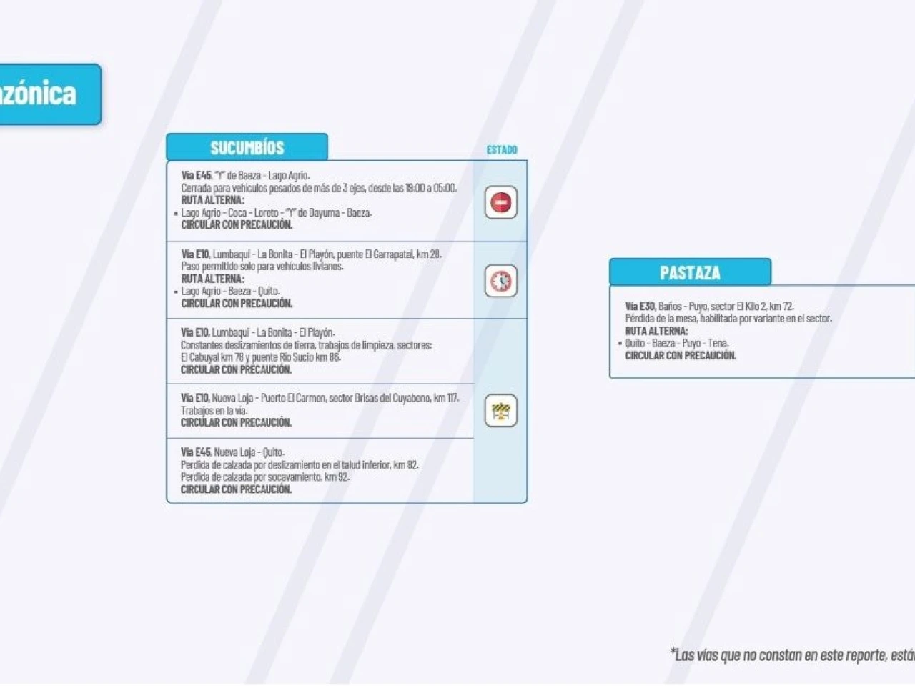 El Ministerio de Transporte y Obras Públicas (MTOP) en su cuenta de X publica el estado de las vías de la Amazonía ecuatoriana. A continuación, compartimos información que le podría interesar.