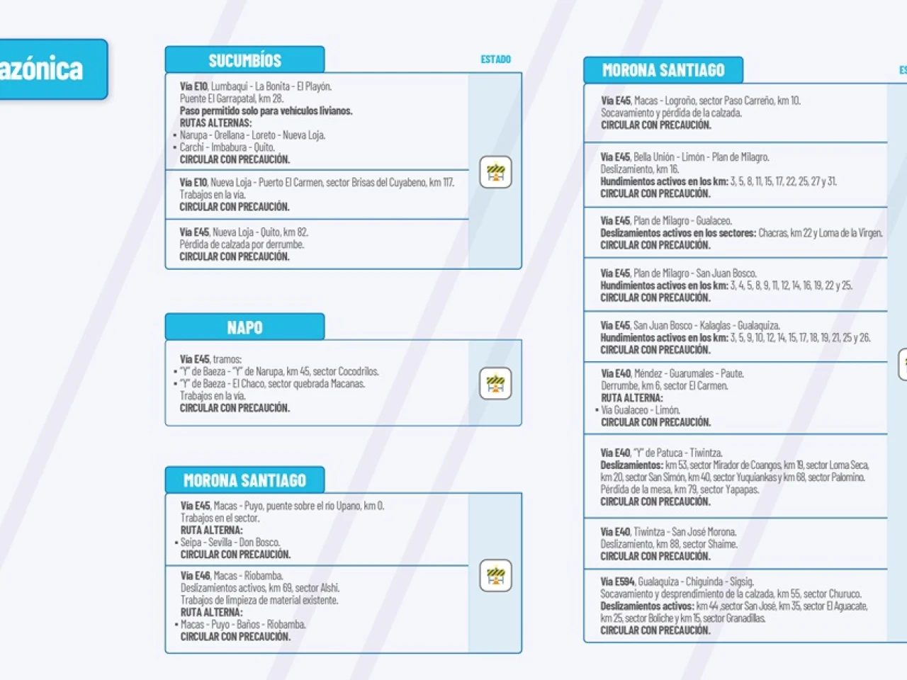 Vía E40: “Y” de Patuca-Tiwintza. Deslizamientos, km 53, Sector Mirador de Coangos, km 19 sector Loma Seca, km 12 Sector San Simón, km 40 sector Yuquiankas, km 68 sector Palomnino. Pérdida de la mesa de la vía, km 79 sector Yapapas. Circular con precaución.