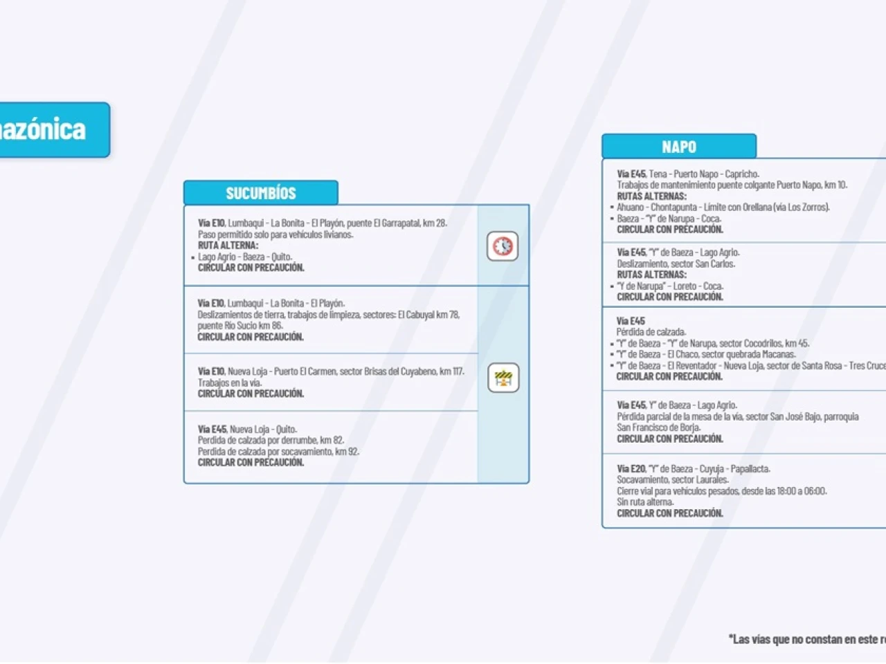 Vía E40: “Y” de Patuca-Tiwintza. Deslizamientos, km 53, Sector Mirador de Coangos, km 19 sector Loma Seca, km 12 Sector San Simón, km 40 sector Yuquiankas, km 68 sector Palomnino. Pérdida de la mesa de la vía, km 79 sector Yapapas. Circular con precaución.