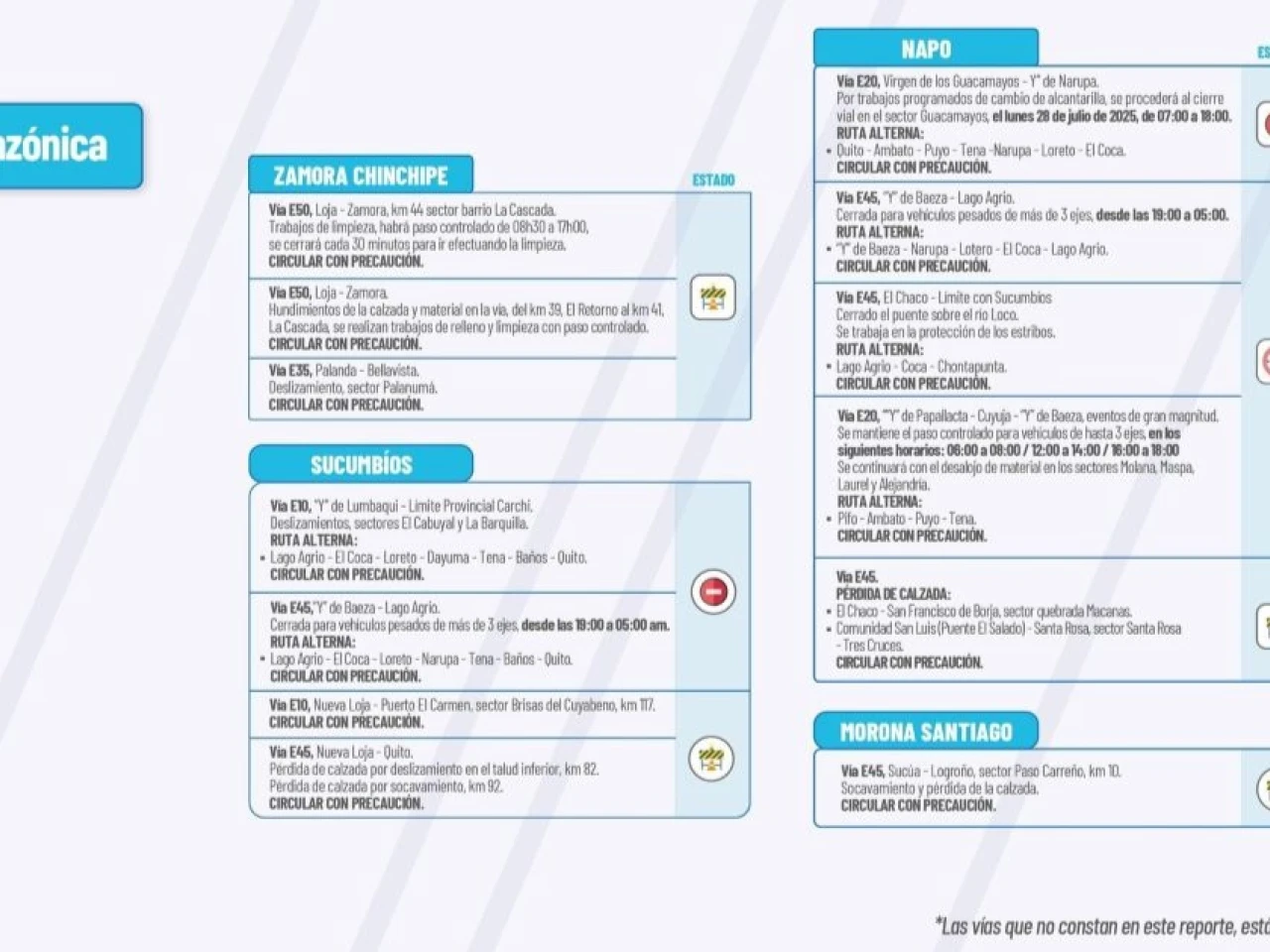 Vía E20: Virgen de los Guacamayos – Y de Narupa. Por trabajos programados de cambio de alcantarilla, se procederá el cierre vial en el sector Guacamayo, el lunes 28 de julio de 2025, de 07h00 a 16h00. Ruta Alterna: Quito-Ambato-Puyo-Tena-Narupa-Loreto-El Coca.