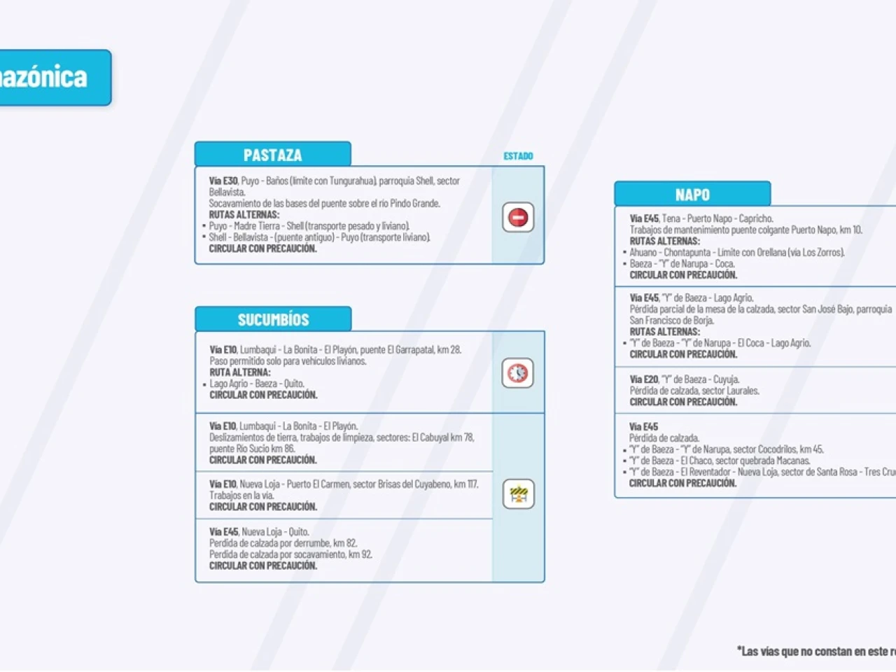 Vía E45: Bella Unión-Limón-Plan de Milagro. Deslizamiento km 16. Hundimientos activos: km 3, km 5, km 8, km 11, km 15, km 17, km 22, km 25, km 27 y km 31. Circular con precaución.