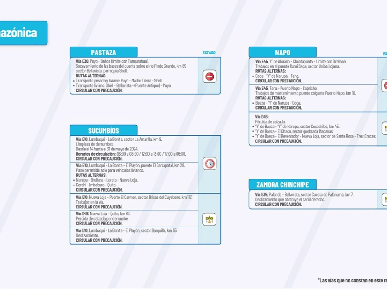Vía E40: “Y” de Patuca-Tiwintza. Deslizamientos, km 53, Sector Mirador de Coangos, km 19 sector Loma Seca, km 12 Sector San Simón, km 40 sector Yuquiankas, km 68 sector Palomnino. Pérdida de la mesa de la vía, km 79 sector Yapapas. Circular con precaución.