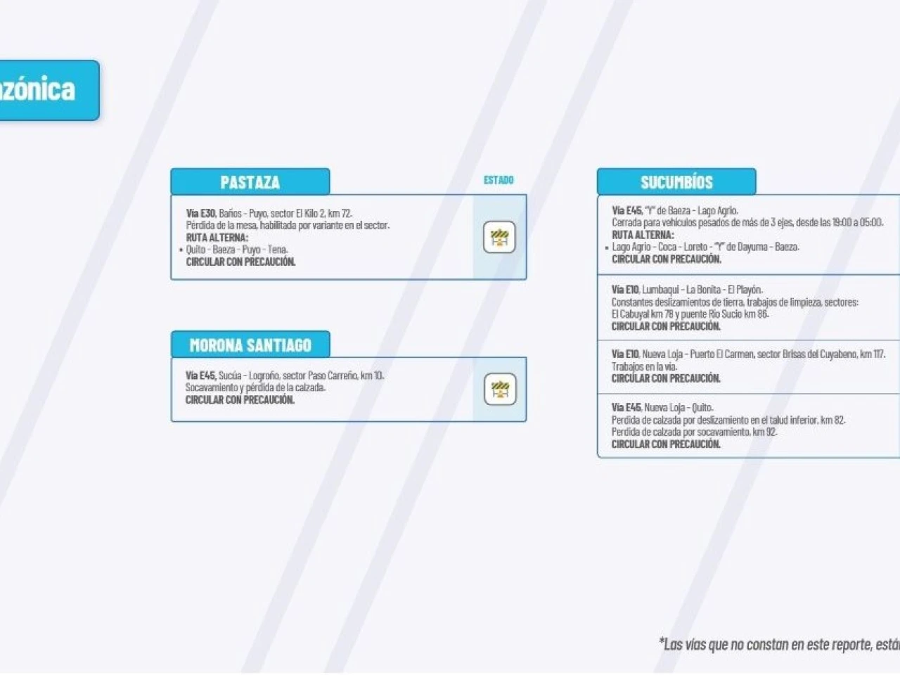 Vía E45: Pérdida de calzada: “Y” de Baeza - “Y” de Narupa, sector Cocodrilos Km 45. “Y” de Baeza-El Chaco, sector quebrada Macanas.  “Y” de Baeza-El Reventador-Nueva Loja, sector Santa Rosa-Tres Cruces. Circular con Precaución.