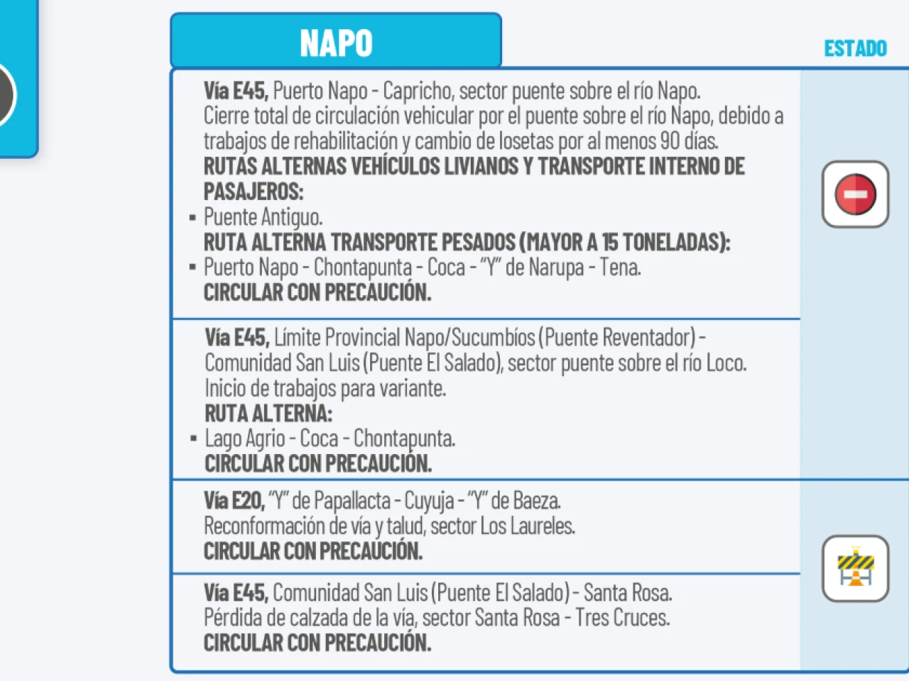 Vía E45: Puerto Napo-Capricho, sector puente sobre el río Napo. Cierre total de circulación vehicular por el puente sobre el río Napo, debido a trabajos de rehabilitación y cambio de losetas por al menos 90 días.