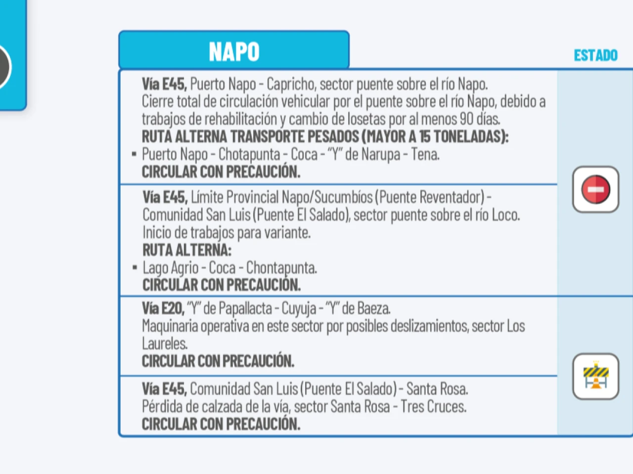Ruta alterna transporte pesado (mayor a 15 toneladas): Puerto Napo-Chotapunta-Coca- “Y” de Narupa-Tena. Circular con precaución.