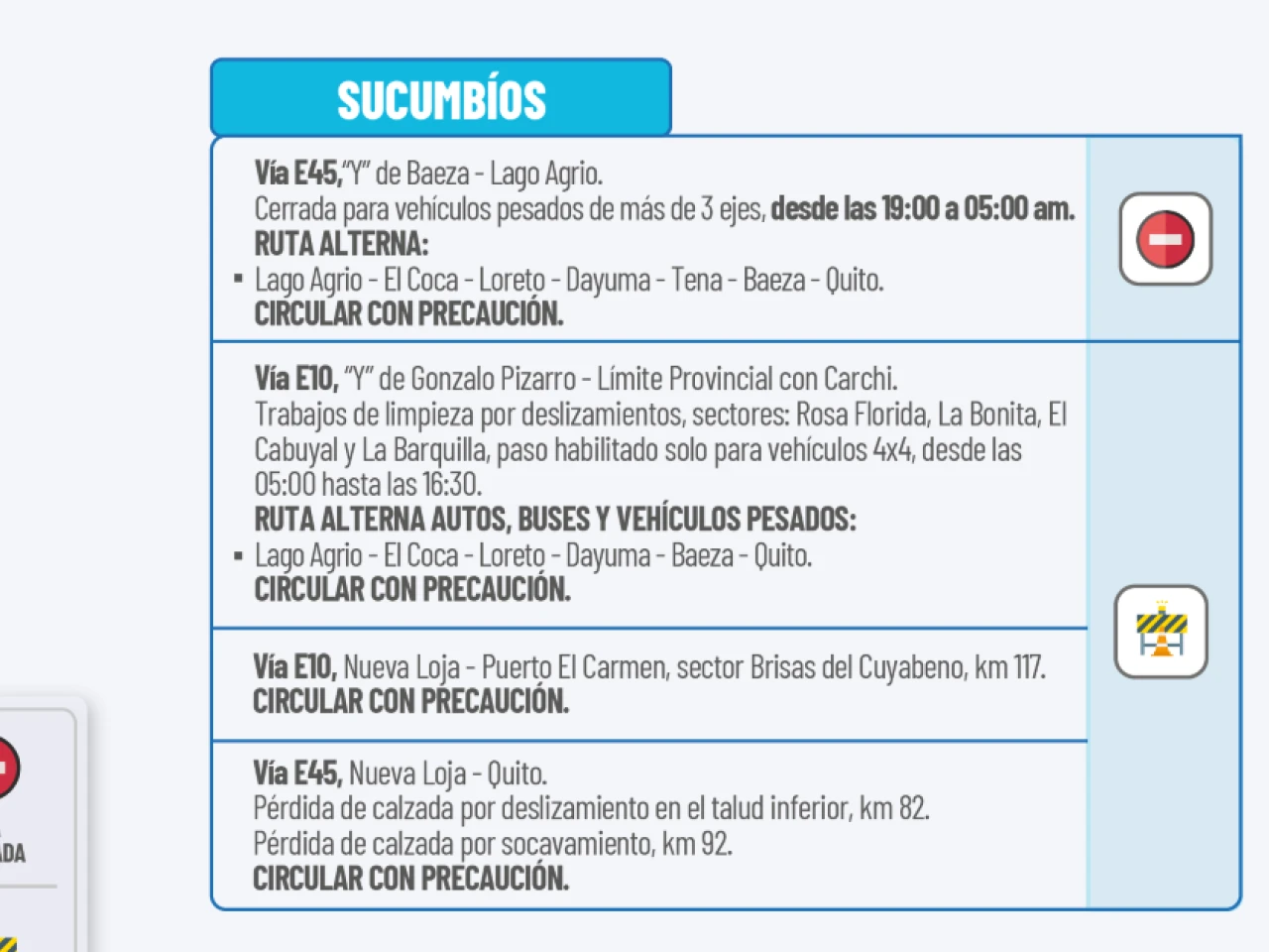 Vía E20: “Y” de Papallacta-Cuyuja- “Y” de Baeza, eventos de gran magnitud. Podrán circular vehículos livianos, transporte de pasajeros y carga moderada de hasta 3 ejes y 12 toneladas. Maquinaria operativa en estos sectores por posibles deslizamientos.