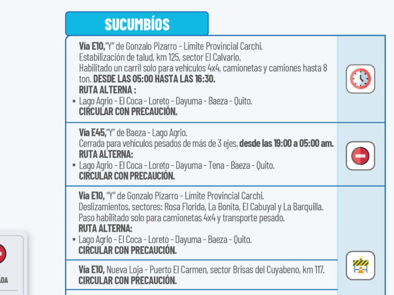 Vía E10: “Y” de Gonzalo Pizarro-Límite Provincial Carchi. Estabilización de talud, km 125, sector El Calvario. Habilitado un carril solo para vehículos 4x4, camionetas y camiones hasta 8 toneladas. Desde las 05:00 hasta las 16:30.