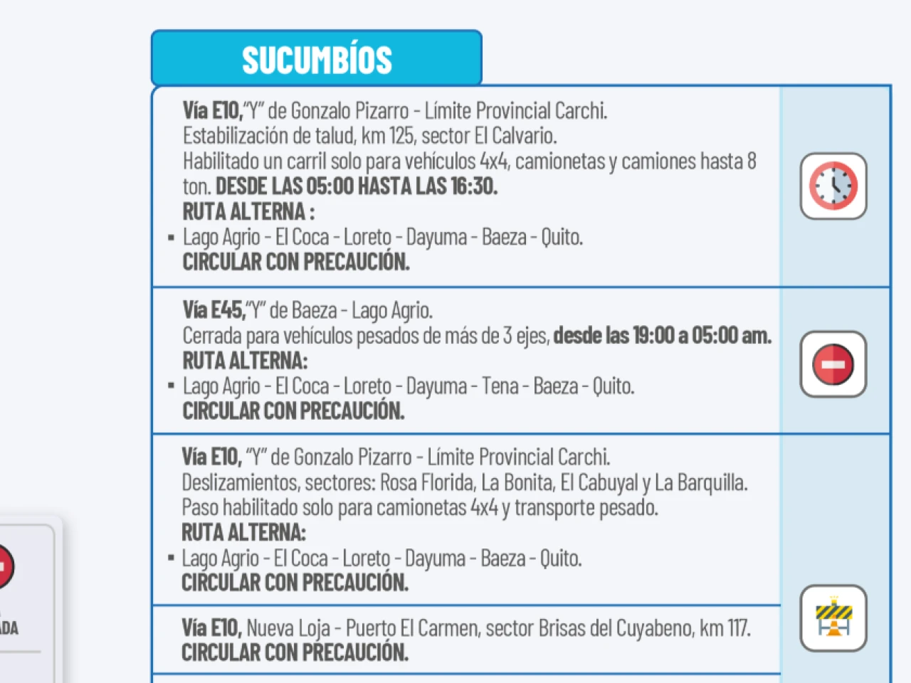 Vía E10: “Y” de Gonzalo Pizarro-Límite Provincial Carchi. Estabilización de talud, km 125, sector El Calvario. Habilitado un carril solo para vehículos 4x4, camionetas y camiones hasta 8 toneladas. Desde las 05:00 hasta las 16:30.