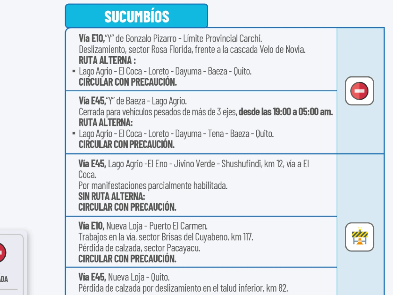 Vía E45: Lago Agrio-El Eno-Jivino Verde-Shushufindi, km 12, vía a El Coca. Por manifestaciones parcialmente habilitada.