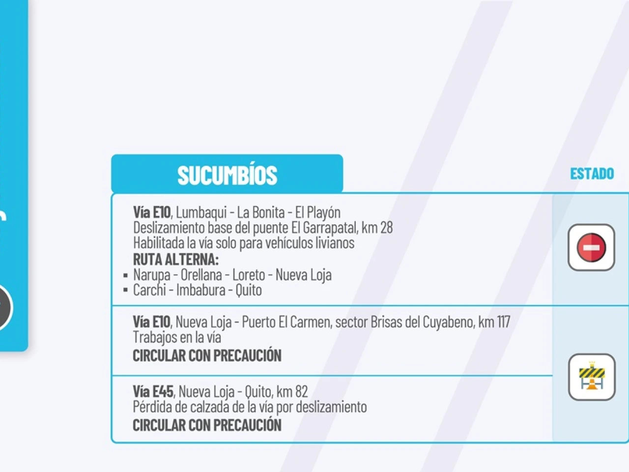 Vía E45: Bella Unión-Limón-Plan de Milagro. Deslizamiento km 16. Hundimientos activos: km 3, km 5, km 8, km 11, km 15, km 17, km 22, km 25, km 27 y km 31. Circular con precaución.