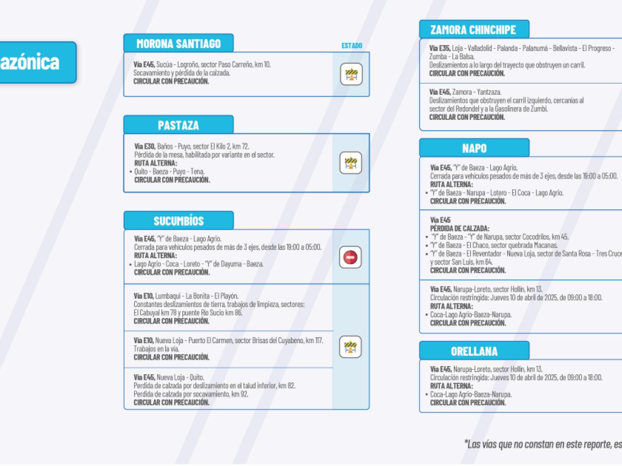 vias carreteras Provincia de Sucumbios provincia de Napo provincia de Pastaza Provincia de Zamora Chinchipe Provincia de Morona Santiago provincia de Orellana Informe vialSíguenos en: