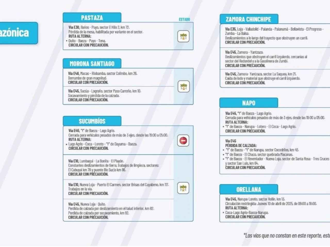 Vía E10:?Lumbaqui-La Bonita-El Playón. Constantes deslizamientos de tierra, trabajos de limpieza sectores: El Cabuyal km 78, puente Río Sucio Km 86. Circular con precaución.