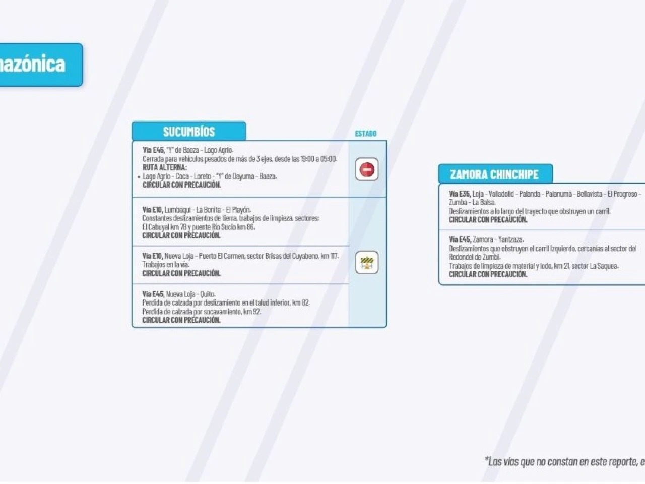 Vía E10:?Lumbaqui-La Bonita-El Playón. Constantes deslizamientos de tierra, trabajos de limpieza sectores: El Cabuyal km 78, puente Río Sucio Km 86. Circular con precaución.