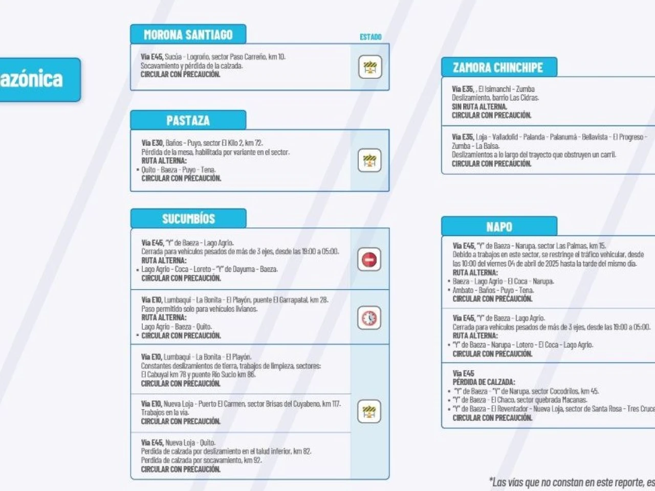 vias carreteras ecuador Sucumbios Pastaza morona santiago Zamora Chinchipe provincia de Napo informe vial ecuadorSíguenos en: