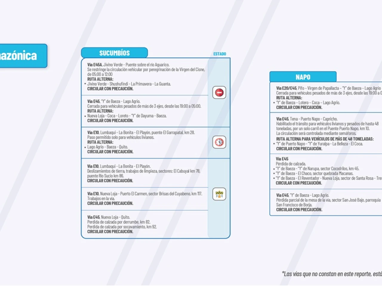 VIA E45:?Tena-Puerto Napo-Capricho.? Habilitado el tránsito para vehículos livianos y pesados de hasta 48 toneladas por un solo carril en el Puente Puerto Napo, km10. La circulación será controlada mediante semáforos. Circular con precaución
