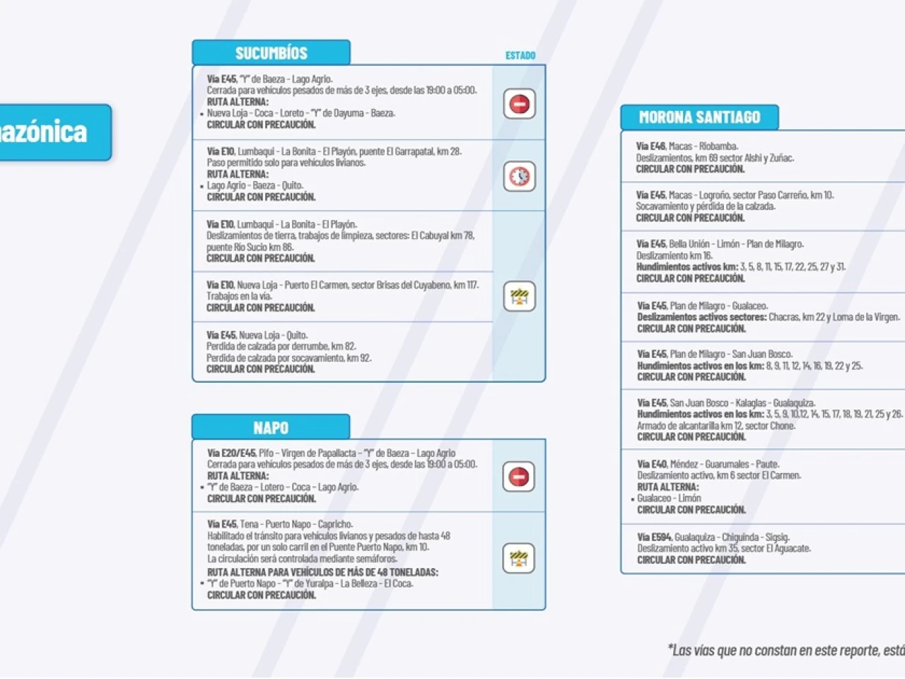 Vía E45:?San Juan Bosco-Kalaglas-Gualaquiza.? Hundimientos activos: km2, km5 km 9, km 10, km 12, km 14, km 15, km 17, km 18, km 19, km 21, km 25, y km 26.? Circular con Precaución.