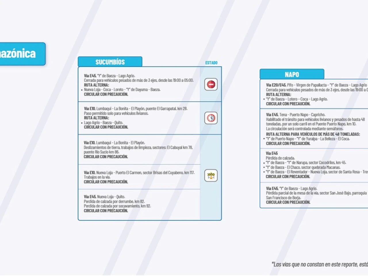 VIA E45:?Pérdida de calzada. “Y” de Baeza-“Y” de Narupa, sector Cocodrilos, km 45.? “Y” de Baeza-El Chaco, sector quebrada Macanas.? “Y” de Baeza-El Reventador-Nueva Loja, sector de Santa Rosa-res Cruces Circular con precaución.?