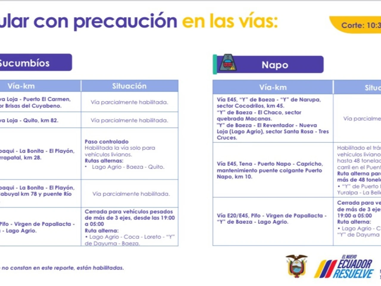 Vía E10:?Lumbaqui-La Bonita-El Playón. Deslizamientos de tierra, trabajos de limpieza sectores: El Cabuyal km 78, puente Río Sucio Km 86. Circular con precaución.